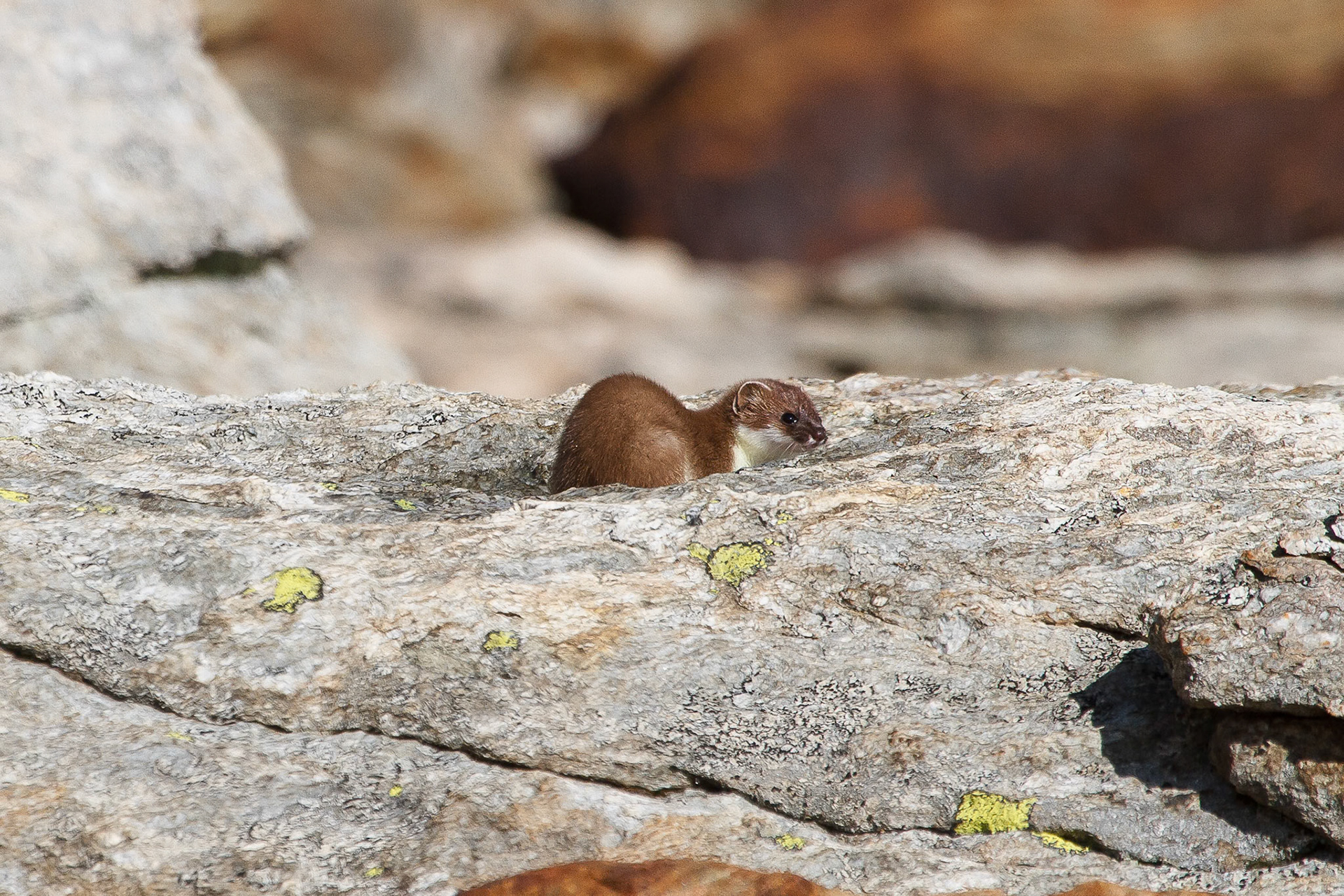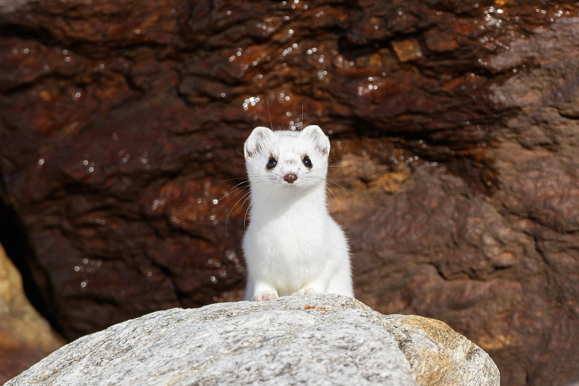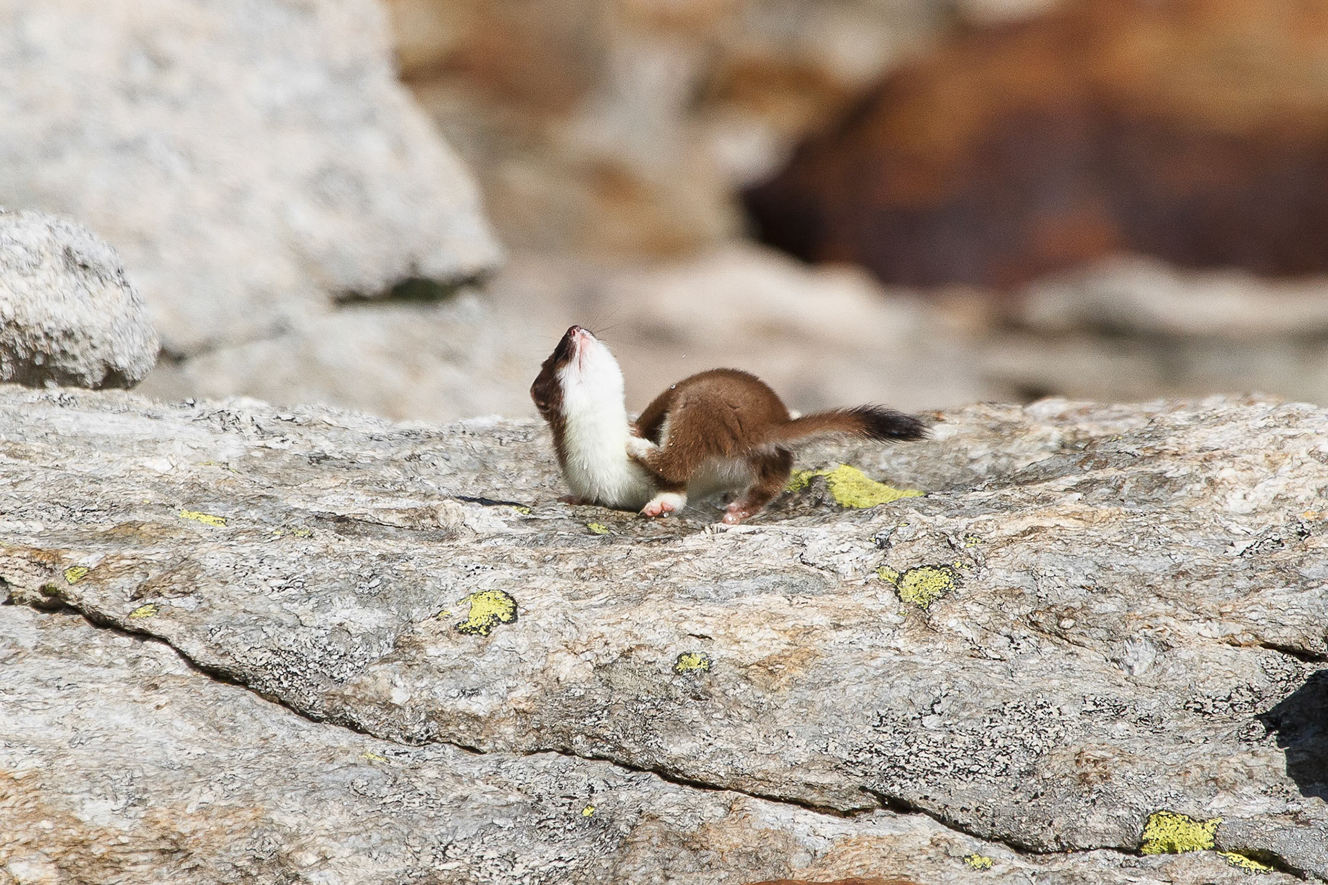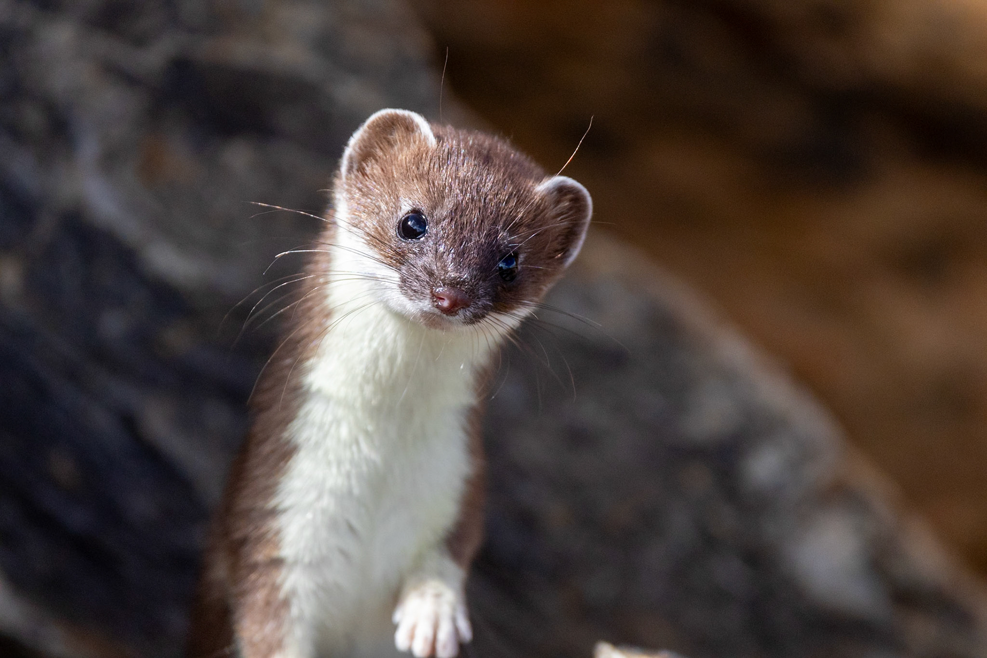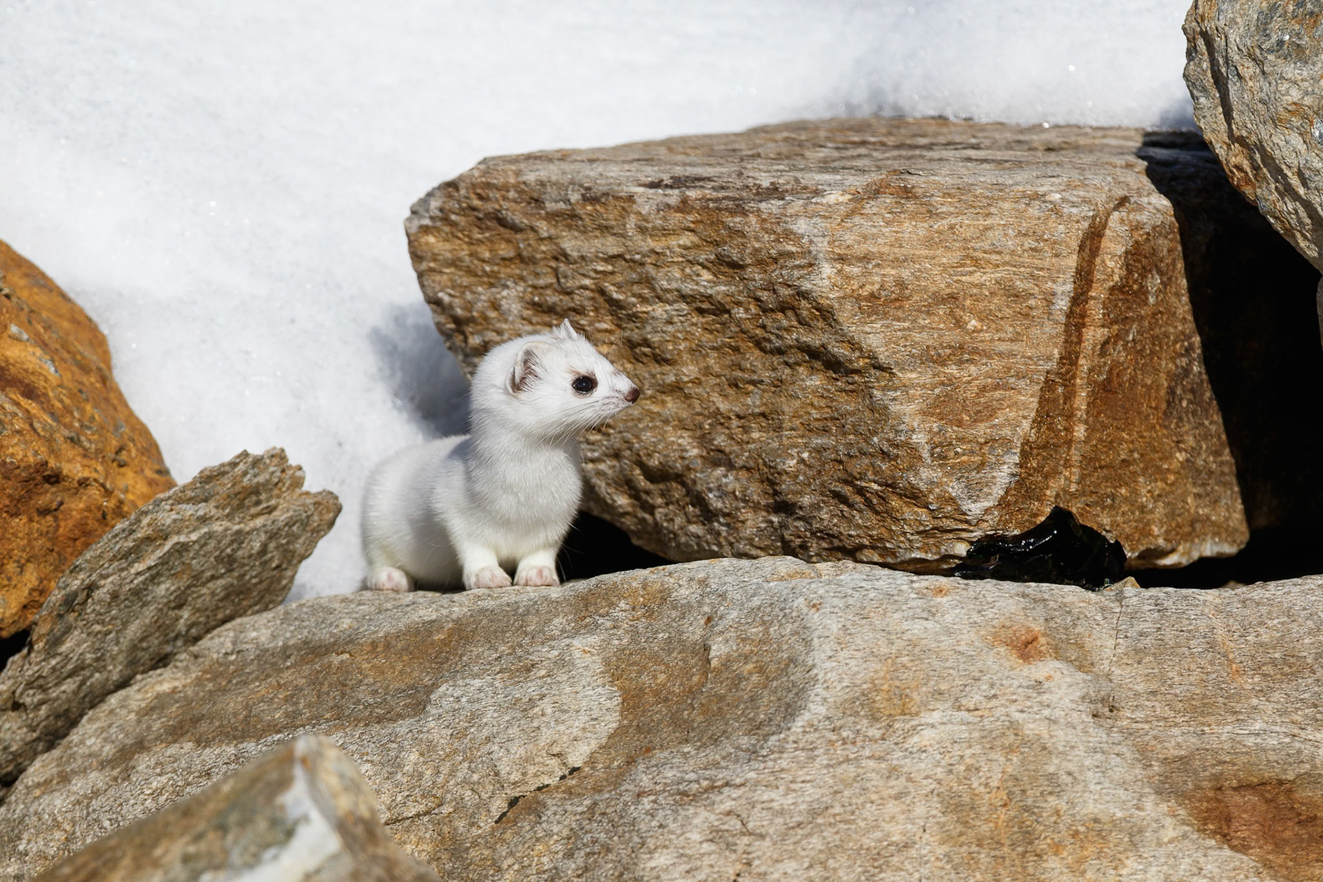 L’ermellino è un piccolo mustelide agile e schivo, diffuso nelle zone alpine, prealpine e nelle aree collinari più fredde. È noto per il suo straordinario cambio di livrea: in estate presenta un mantello bruno sul dorso e biancastro sul ventre, mentre in inverno diventa completamente bianco, ad eccezione della punta della coda che rimane sempre nera. Questo mimetismo stagionale gli permette di cacciare con efficacia e di sfuggire ai predatori. L’ermellino è spesso confuso con la donnola, a cui somiglia molto; tuttavia, si distingue facilmente per la caratteristica punta della coda nera e, in inverno, per il manto completamente bianco, mentre la donnola non presenta né il ciuffo nero né la stessa trasformazione della livrea.
