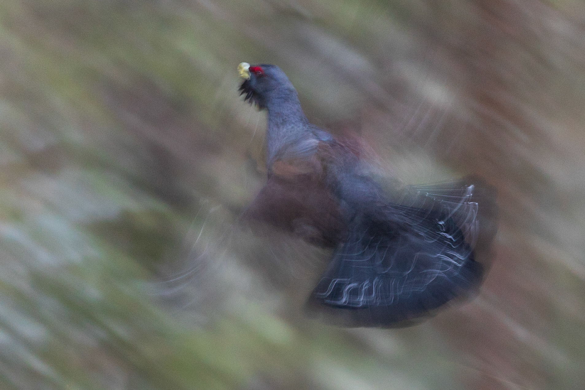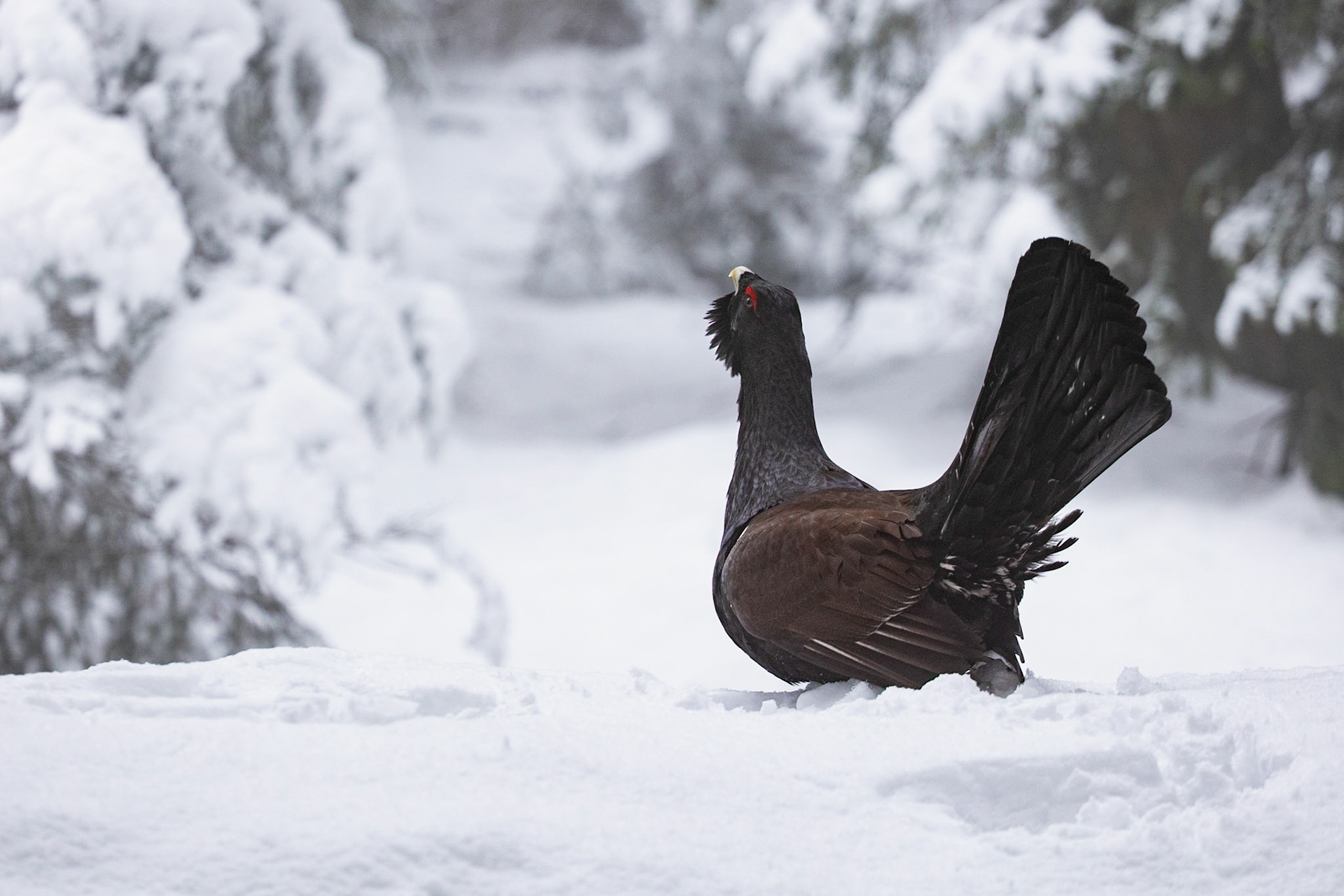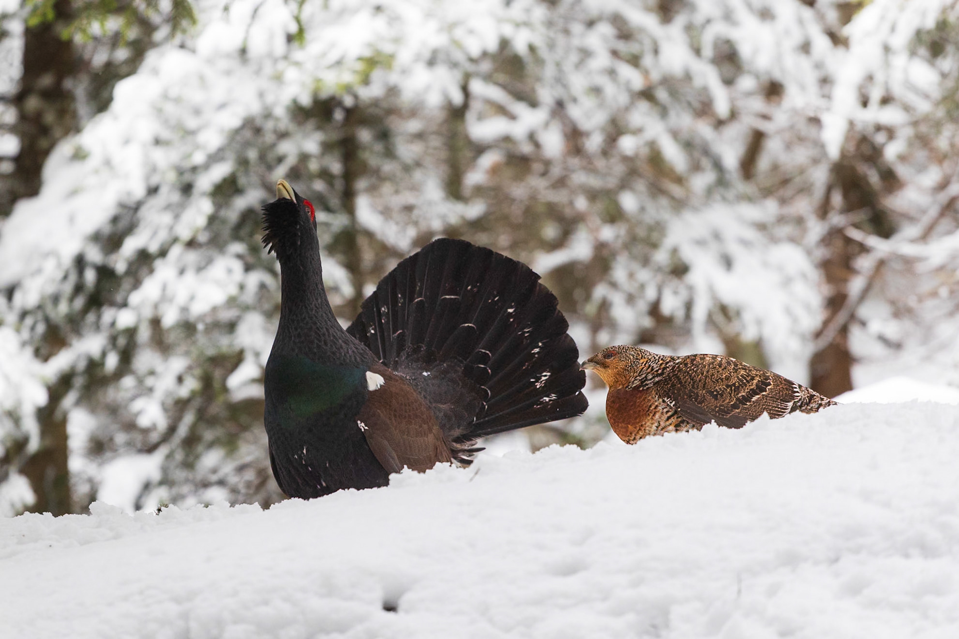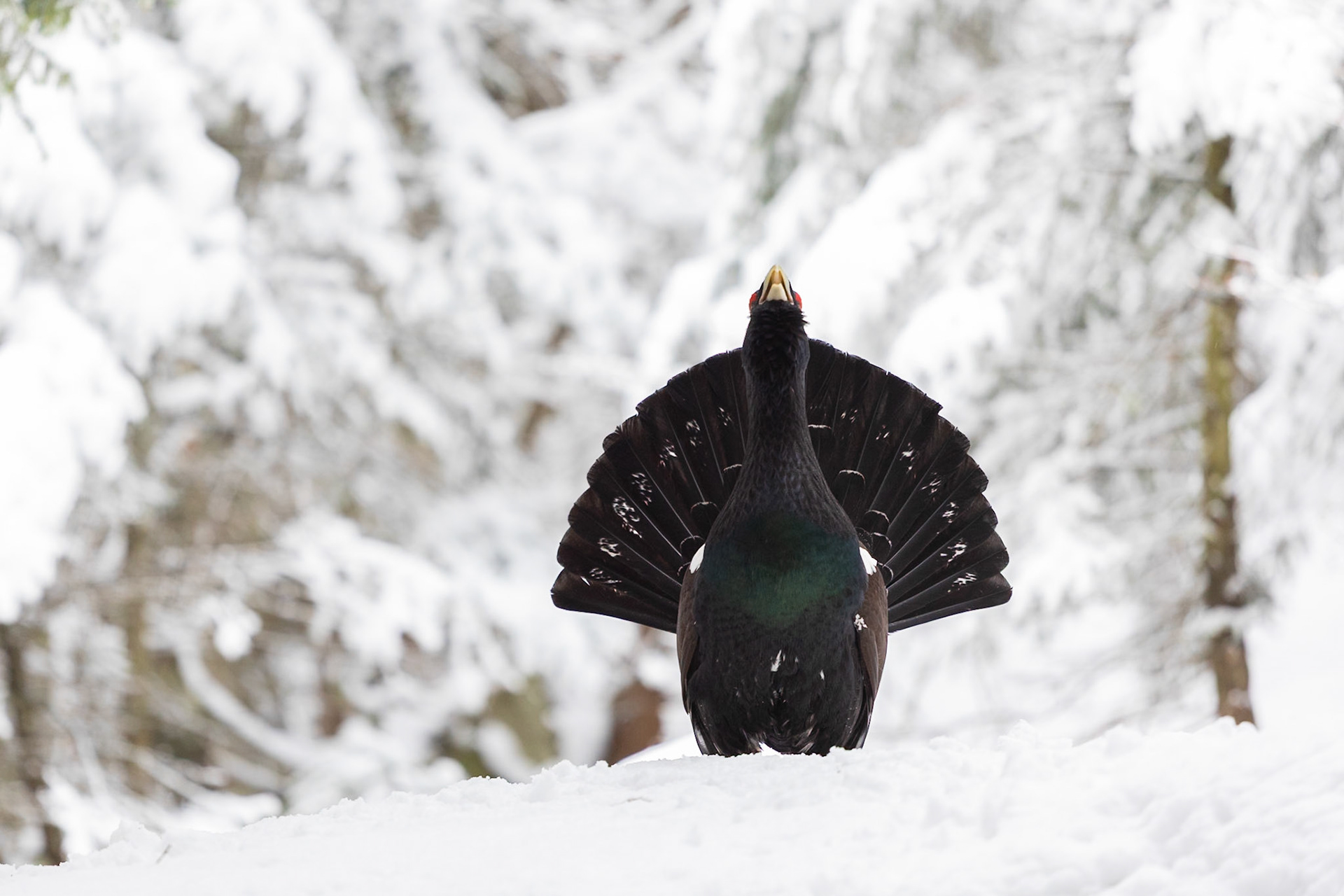Arriva finalmente il momento della verità. Alle due del mattino lasciamo il parcheggio. La neve si è ritirata e in mezz’ora siamo sul posto. Raggiunta la zona, spegniamo le pile e proseguiamo oltre, per non disturbarlo, sempre che sia lì. Ci cambiamo con maglie asciutte e, una volta pronti, ci muoviamo verso il capanno. Nel buio non è semplice: bisogna fare attenzione, non fare rumore e non perdere tempo. Appena trovato il capanno, entriamo in fretta e ci caliamo nel silenzio più assoluto. Se quella è davvero la zona del canto, non possiamo permetterci di disturbarlo: una fotografia non vale il danno che potremmo arrecare al suo accoppiamento.La notte è umida e fredda, non riesco a dormire. Verso le cinque, quando il gelo si fa più intenso e cerco di rannicchiarmi per scaldarmi un po’, finalmente, in lontananza, sento “tic-ap, tic-ap”. L’avevo immaginato tante volte, al punto da sentirlo anche quando non c’era, ma questa volta è diverso: questa volta è reale. Sveglio Ivan con due colpi sulla spalla: “Zitto, ascolta”. È lui. Non è lontano, anche se ancora non si vede. Dopo poco sentiamo un involo, poi un secondo: atterra a meno di dieci metri da noi. Inizia la danza. Il canto, la parata, i salti… tutto come lo avevamo immaginato, anzi, sognato. Non c’è luce per fotografare, restiamo immobili a osservarlo per qualche minuto. Poi se ne va. Più tardi ritorna e, finalmente, ci concede anche qualche scatto.