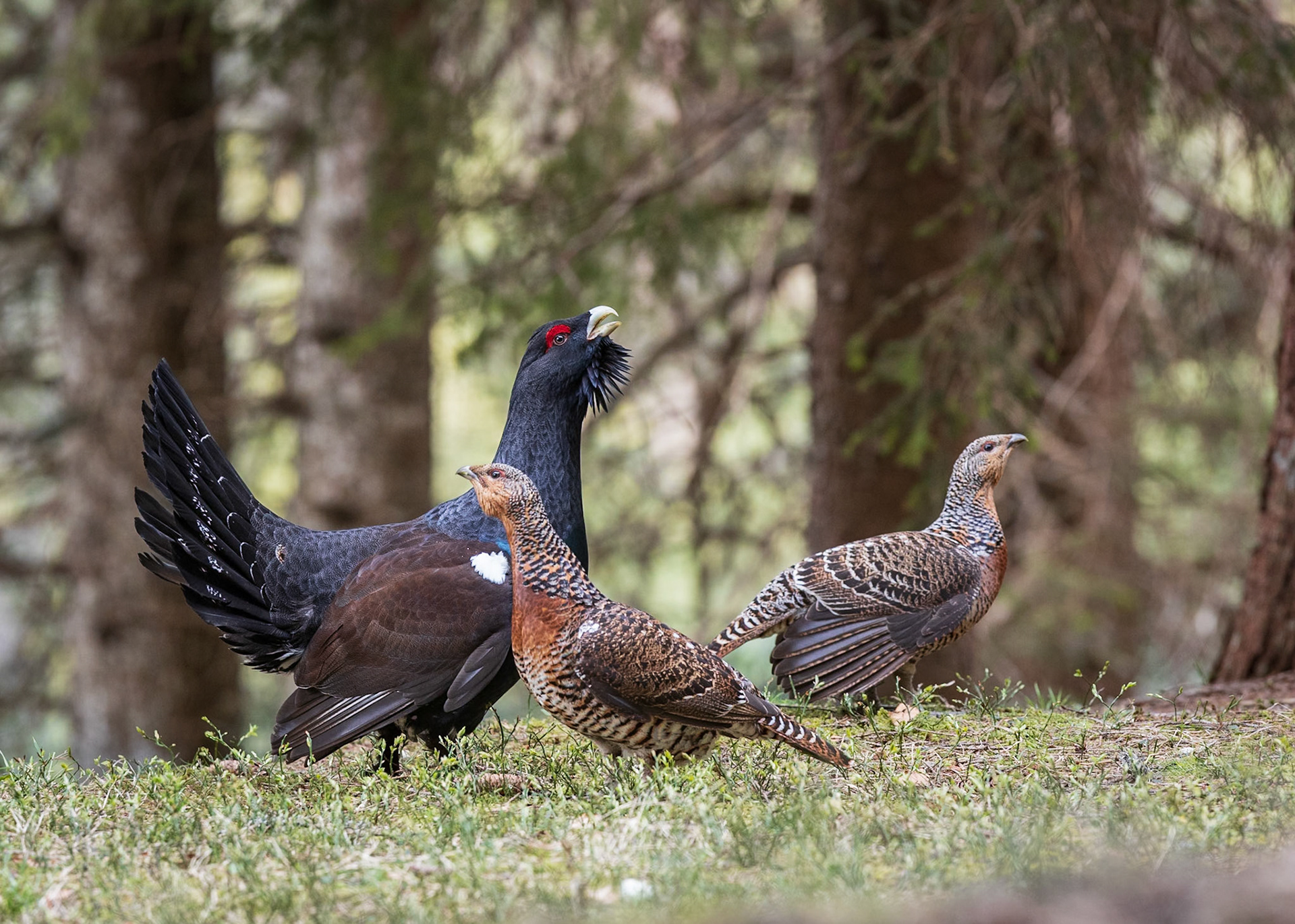 Durante la primavera, il gallo cedrone mette in scena uno degli spettacoli più suggestivi della natura alpina: il canto e la parata nuziale. All’alba, nel cuore del bosco, il maschio si posiziona su un albero o in una radura e intona il suo canto inconfondibile, un susseguirsi di suoni ritmici che culminano con il celebre “pop”, simile allo stappo di una bottiglia. Il canto completo è una sequenza di note che inizia con un ritmo crescente “tic-ap, tic-ap, tic-ap”, seguito da una serie di suoni metallici e infine dal “pop” conclusivo, accompagnato da sibili e fruscii appena percettibili. Mentre canta, il gallo gonfia il petto, apre la coda e compie movimenti rituali per conquistare le femmine e difendere il proprio territorio da altri maschi. La femmina, più discreta, emette invece un verso breve e gutturale, descritto come un “co co” sommesso, che utilizza per mantenere il contatto con i pulcini o con il maschio durante la stagione riproduttiva.