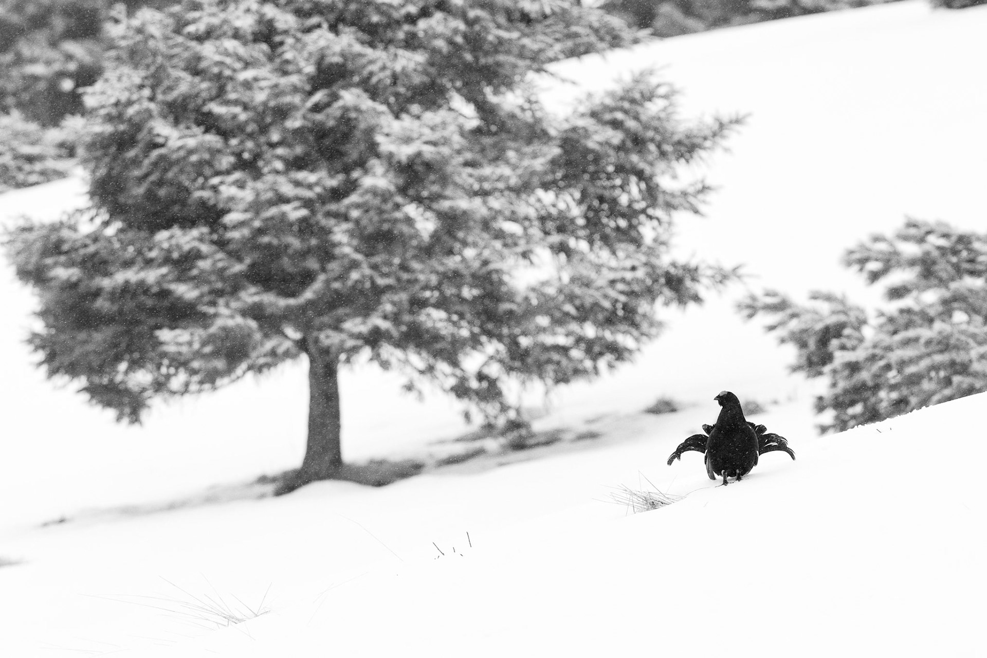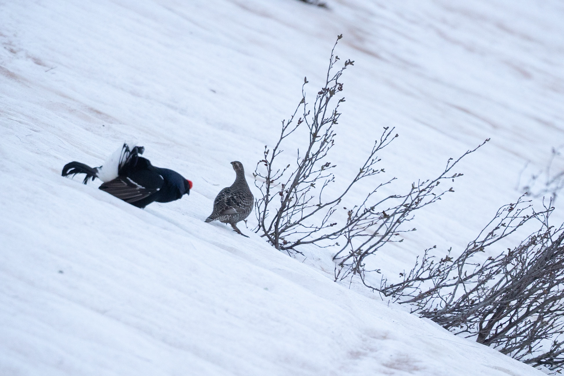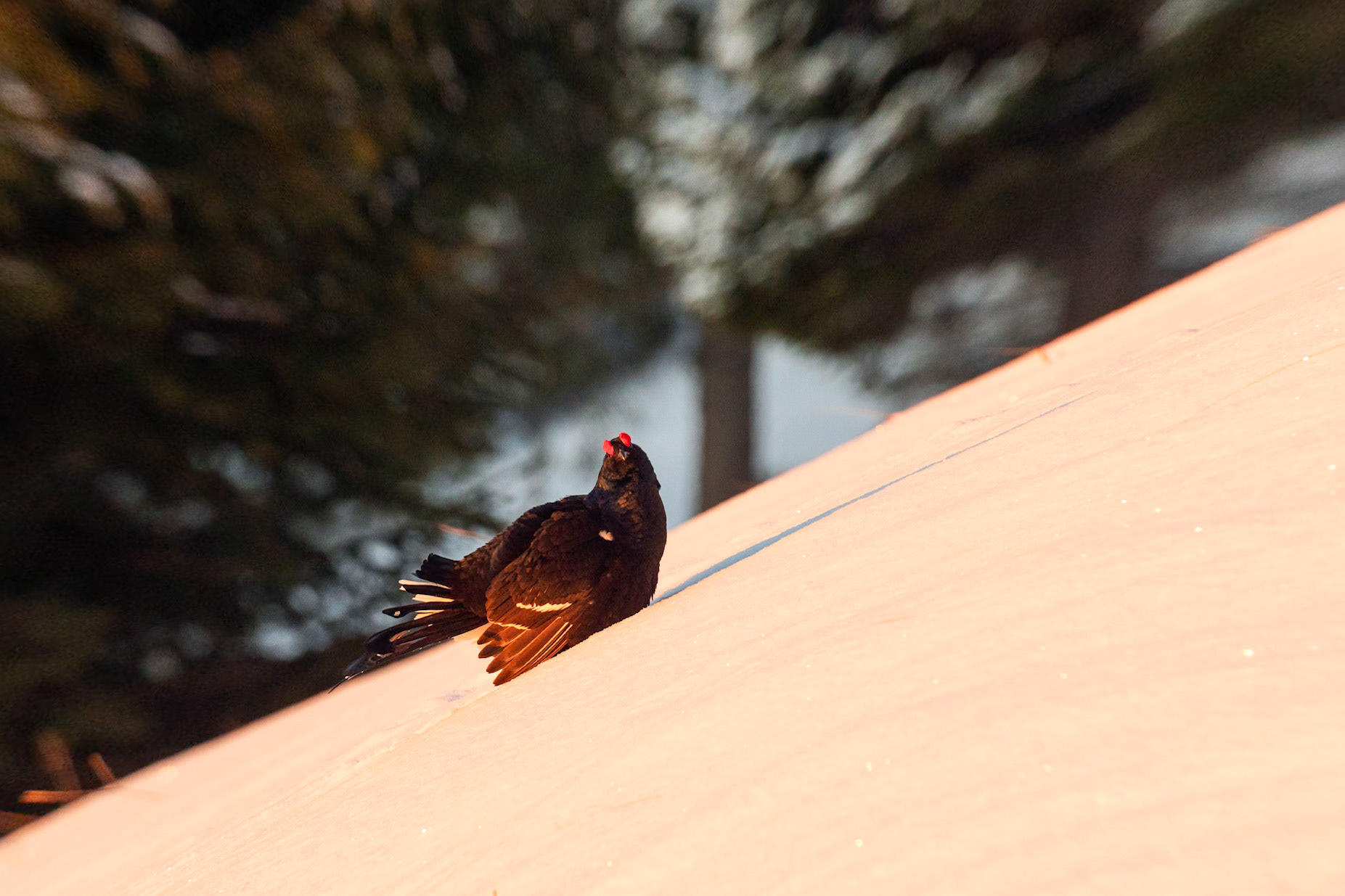 Durante l’inverno i galli forcelli sopravvivono al gelo rifugiandosi nella “truna”, una cavità scavata nella neve che offre isolamento termico e protezione dai predatori.
