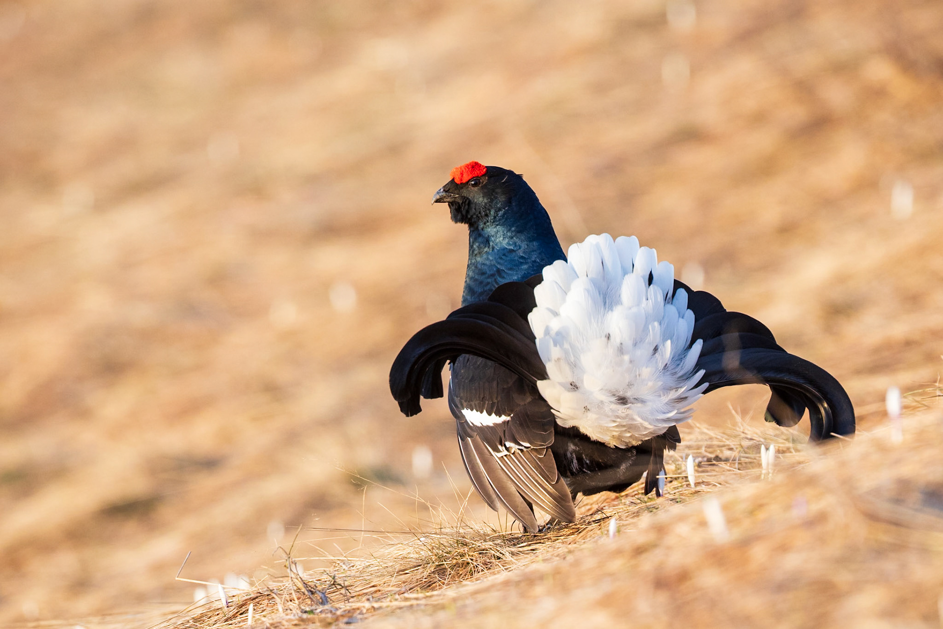 Il fagiano di monte, noto anche come gallo forcello, è un elegante tetraonide delle zone alpine e prealpine. Il maschio si distingue per il piumaggio nero lucente con riflessi blu, le caratteristiche “caruncole” rosse sopra gli occhi e la coda a forma di lira. Le caruncole sono strutture carnose di colore acceso che si ingrossano durante la stagione degli amori e servono come segnale visivo nelle parate di corteggiamento.