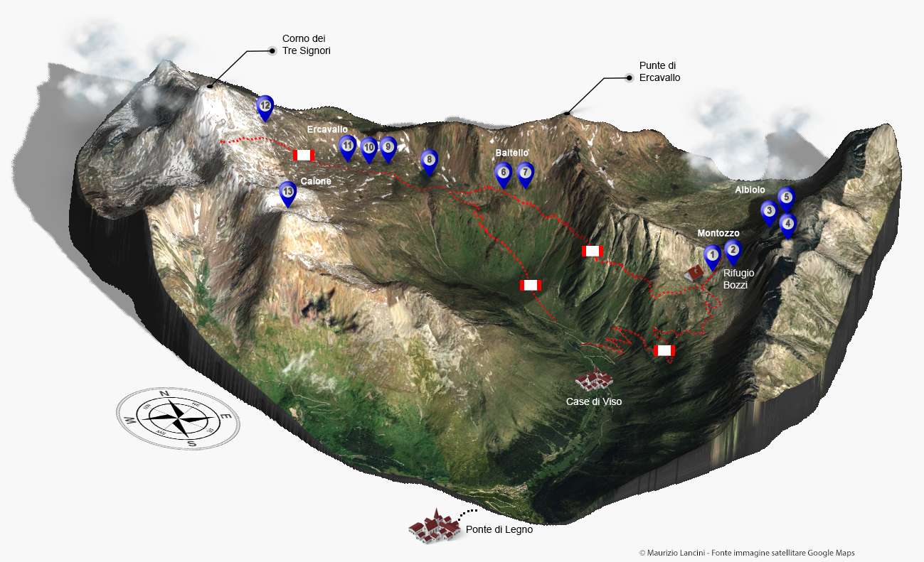 Si sconfina in territorio trentino per raggiungere i Laghetti d’Albiolo, situati su un terrazzamento a nord del Torrione d’Albiolo. L’accesso più semplice per chi proviene dalla Valle Camonica è quello attraverso la Valle di Viso: una volta raggiunto il Rifugio Bozzi, si prosegue verso la Forcella del Montozzo. Da qui si imbocca il sentiero degli Austriaci in direzione del Torrione d’Albiolo, percorrendolo solo per un breve tratto, fino a incontrare una traccia evidente — soprattutto nella zona della pietraia — che devia a sinistra e conduce direttamente ai laghetti.